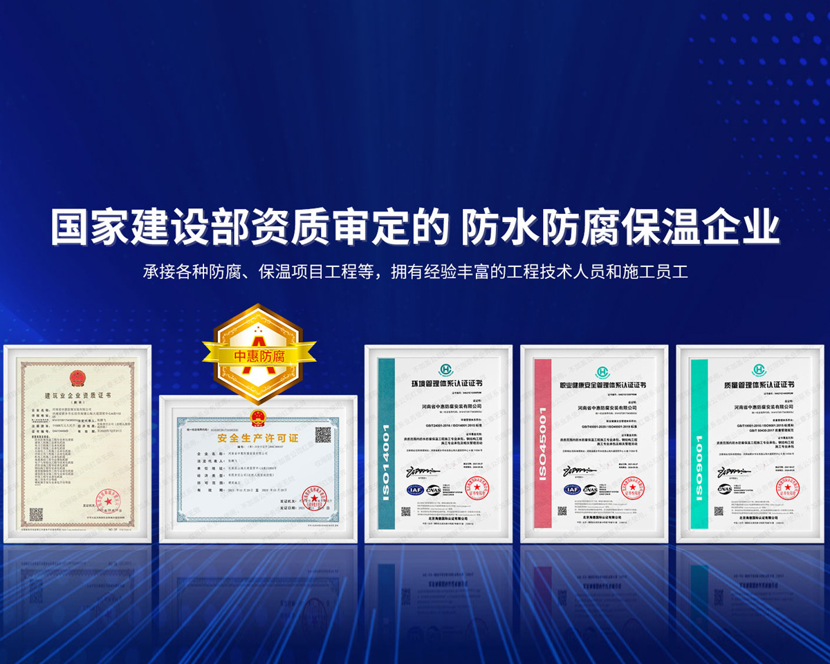 公司經營范圍:防水防腐保溫工程;消防設施工程;建筑裝修裝飾工程;建筑機電安裝工程;電力工程;建筑工程;石油化工工程;工業清洗工程;油罐清洗工程;鋼結構工程;環保工程;模板腳手架工程;電纜防火封堵、防污閃噴涂、外墻外保溫工程;各類施工勞務作業;設備維修、船舶鉚焊、涂裝;電力工程材料、建材、防水材料、防火材料、防腐保溫材料銷售,并相繼通過了GB/T19001-2008idtISO9001:2008GB/T50430-2007質量管理體系認證證書。GB/T24001-2004idtISO14001:2004環境管理體系認證證書。GB/T28001-2011idtOHSAS18001:2007職業健康安全管理體系認證證書。公司是中國防腐蝕于防護協會、中國施工企業管理協會、電力協會和中國鋼結構防水協會會員單位。 公司的經營業務涵蓋了石油、化工、電力、冶金、煤炭、船舶、國防、燃氣、水利、環保、交通運輸、航空及國防軍工和輕紡市政等行業的防腐保溫絕熱設備。鋼結構安裝、防火、防水、金屬噴鍍、聚脲噴繪、陰極保護、防滲透堵漏、玻璃鋼及各種磚版材料襯里、橡膠襯里、煙氣硫和耐酸溶劑腐蝕等工程施工。公司連續十年榮獲“省市先進施工企業”“安全生產先進單位”“重合同,守信用企業”和“AA***資質企業”的稱號。2000年被命名為市級文明單位,2002年被國家工商行政管理局命名為“重合同,守信用的企業”、被中國工業防腐蝕技術協會命名為“防腐蝕企業,能源節約及環境保護領域有豐富的經驗和***的業績。工程一次交驗合格率100%。其中攀枝花鋼鐵公司煉鐵廠四號高爐及熱風爐防腐工程、上海寶鋼公司煤氣柜防腐工程、撫順石油一廠裝置防腐項目、齊魯石化公司稀烴廠高塔防腐工程、吉林化學工業公司煉油廠油罐防腐工程、天津石化熱電廠六號爐頂棚聯絡管保溫工程、大慶油田(太倉)力神泵業工程、中國化學工程第十一建設工程、中原油田勘探局工程、中國石化銷售有限公司華北分部、魯皖輸油管道工程、貴州開磷息烽合成氨工程、陜西黃陵煤化工程、中國石油天然氣西部管道塔里木輸油工程、邯鋼集團邯寶鋼鐵公司煉鐵工程、德州供電工程、吉寶(南通)船廠工程,偃師華潤熱力工程、鄭州熱力總公司。 河南省中惠防腐安裝有限公司愿以豐富的施工經驗,***的技術,***的設備,***的管理,***的服務,竭誠為國內外廣大的用戶提供***滿意、******的工程作品。 我公司愿與國內外同仁一道,團結協作,共同推進防腐蝕行業發展! 公司地址:河南省長垣縣建設路北段360號 固定電話:0373-8866488 郵編:453400 網址:http://www_zhff_com_cn.cmeun.com